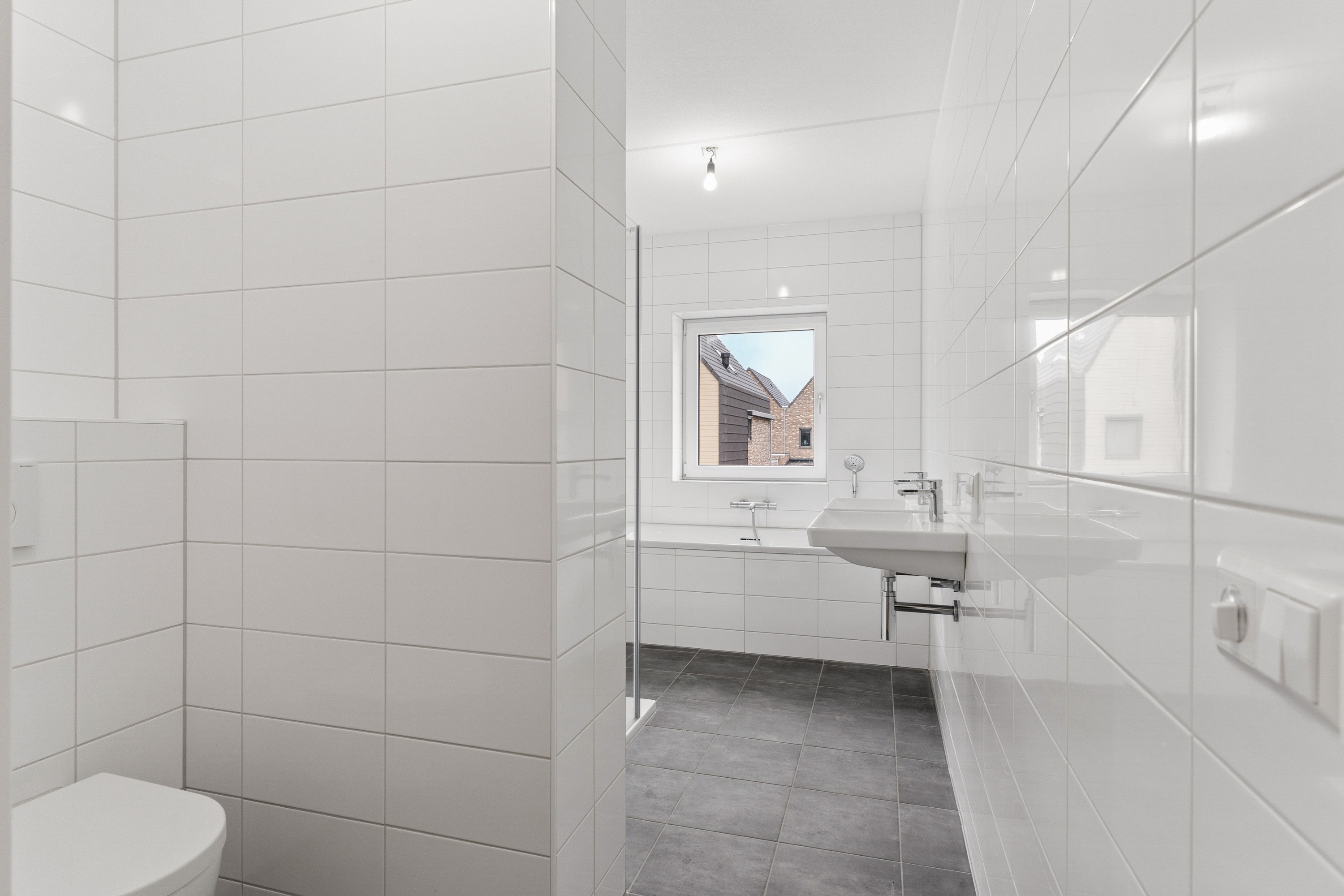 Via de vaste trap bereik je de eerste verdieping met drie ruime slaapkamers en een moderne badkamer. De badkamer is luxe afgewerkt en voorzien van een douchehoek, een ligbad, twee wastafels en een zwevend toilet. De slaapkamers zijn ruim en goed in te delen. De hoofdslaapkamer beschikt zelfs over een inloopkast. Deze verdieping is voorzien van vloerverwarming en een PVC vloer. De muren zijn hier allen gestuukt en klaar om te sauzen.