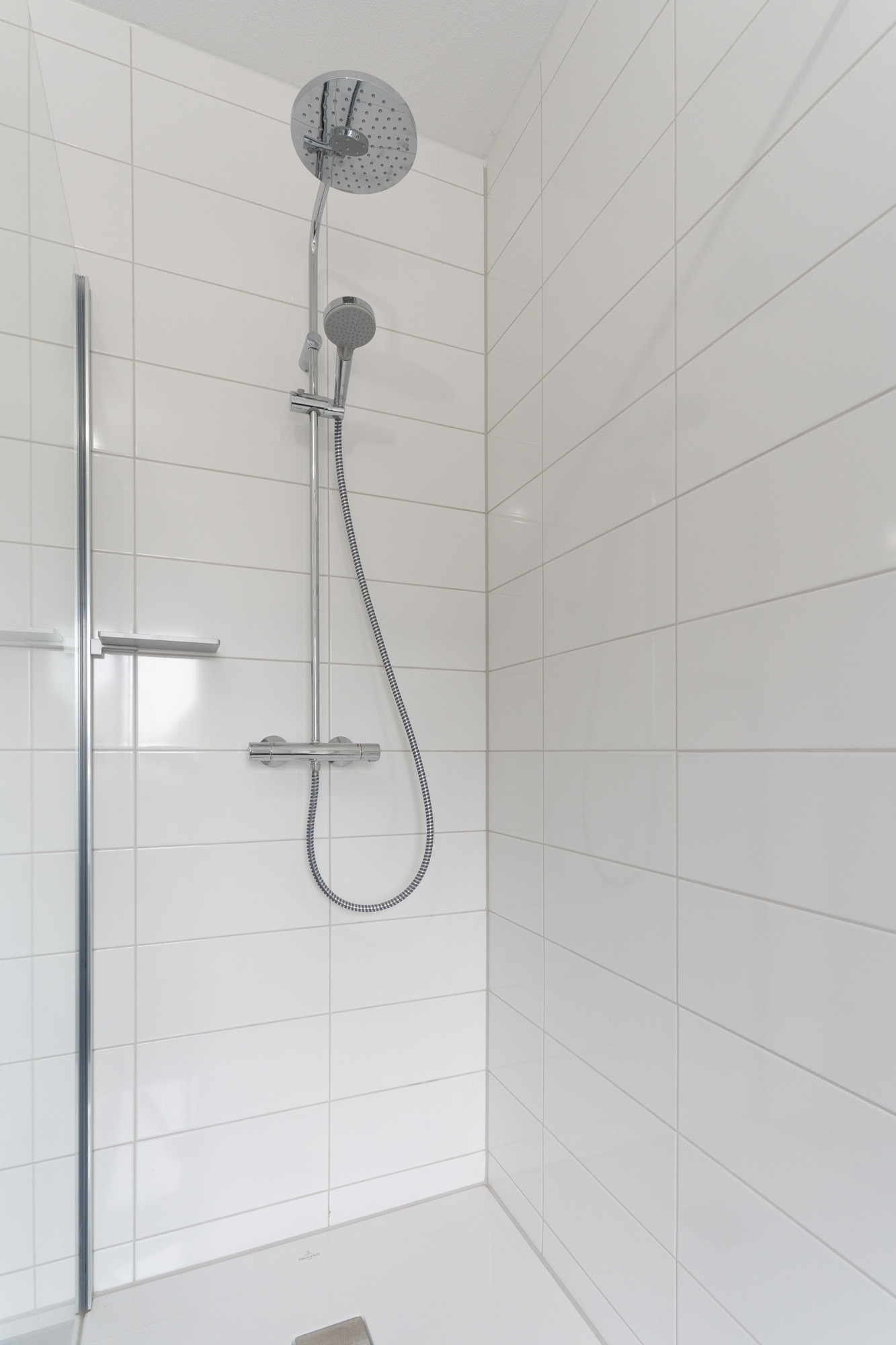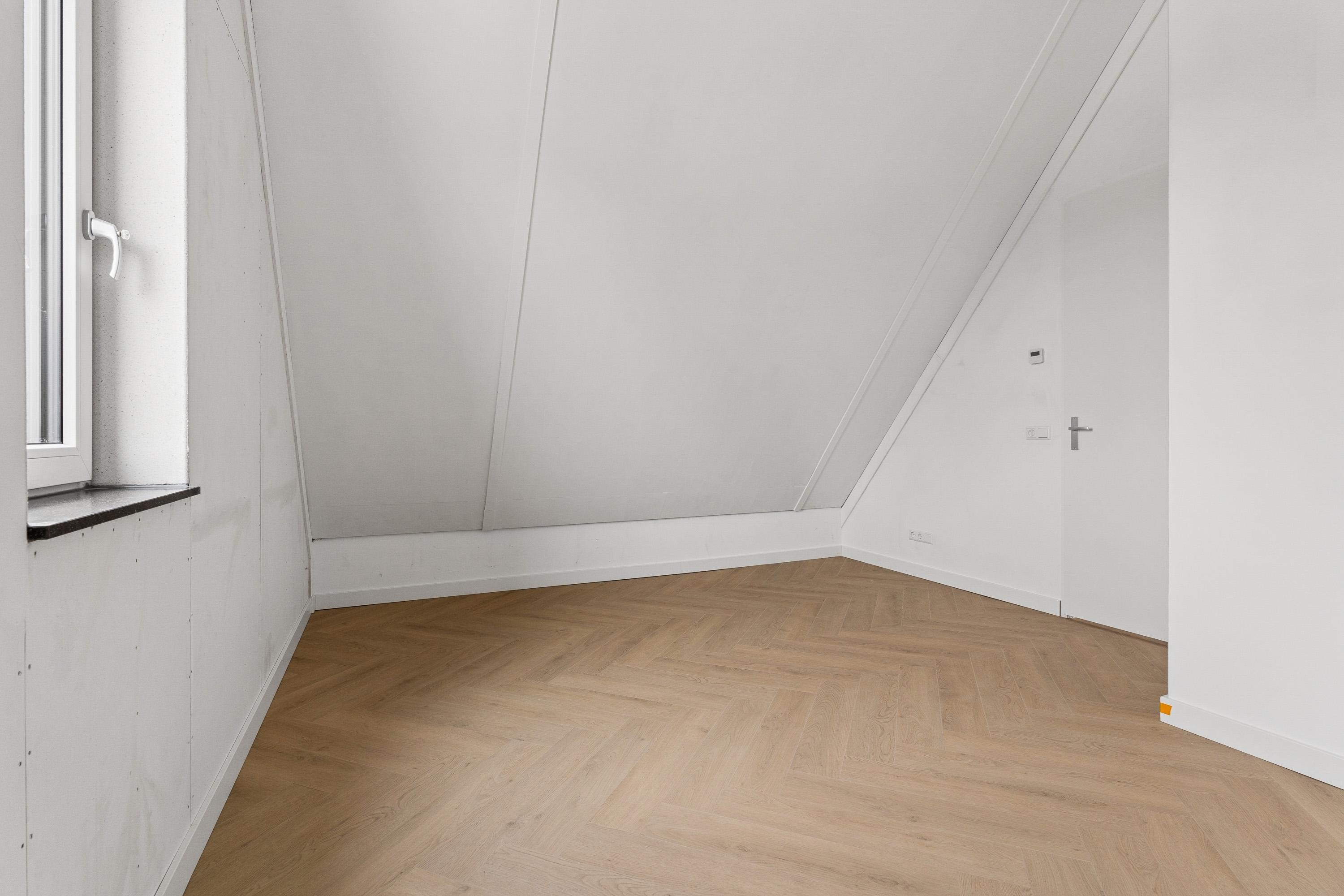De vaste trap leidt naar de tweede verdieping. Op de overloop bevindt zich de opstelplaats voor de wasmachine. Via de overloop is toegang tot nog twee slaapkamers. De technische installaties zijn in een aparte ruimte opgesteld. De zolderverdieping oogt zeer licht en ruim door de vele raampartijen en hoge nok van 3.80. Op de overloop zou ook nog een werkplek of bergruimte gerealiseerd kunnen worden. De gehele verdieping is voorzien van vloerverwarming en een PVC vloer.