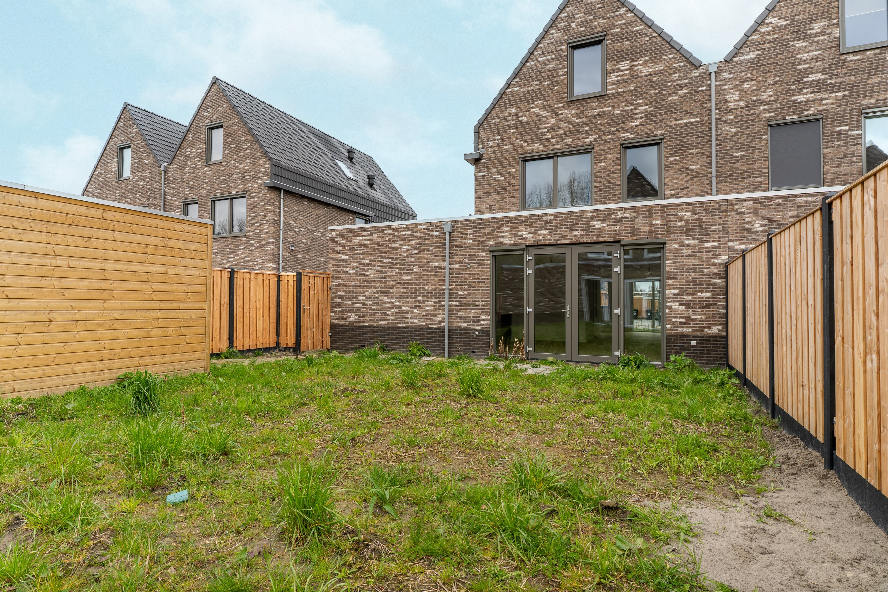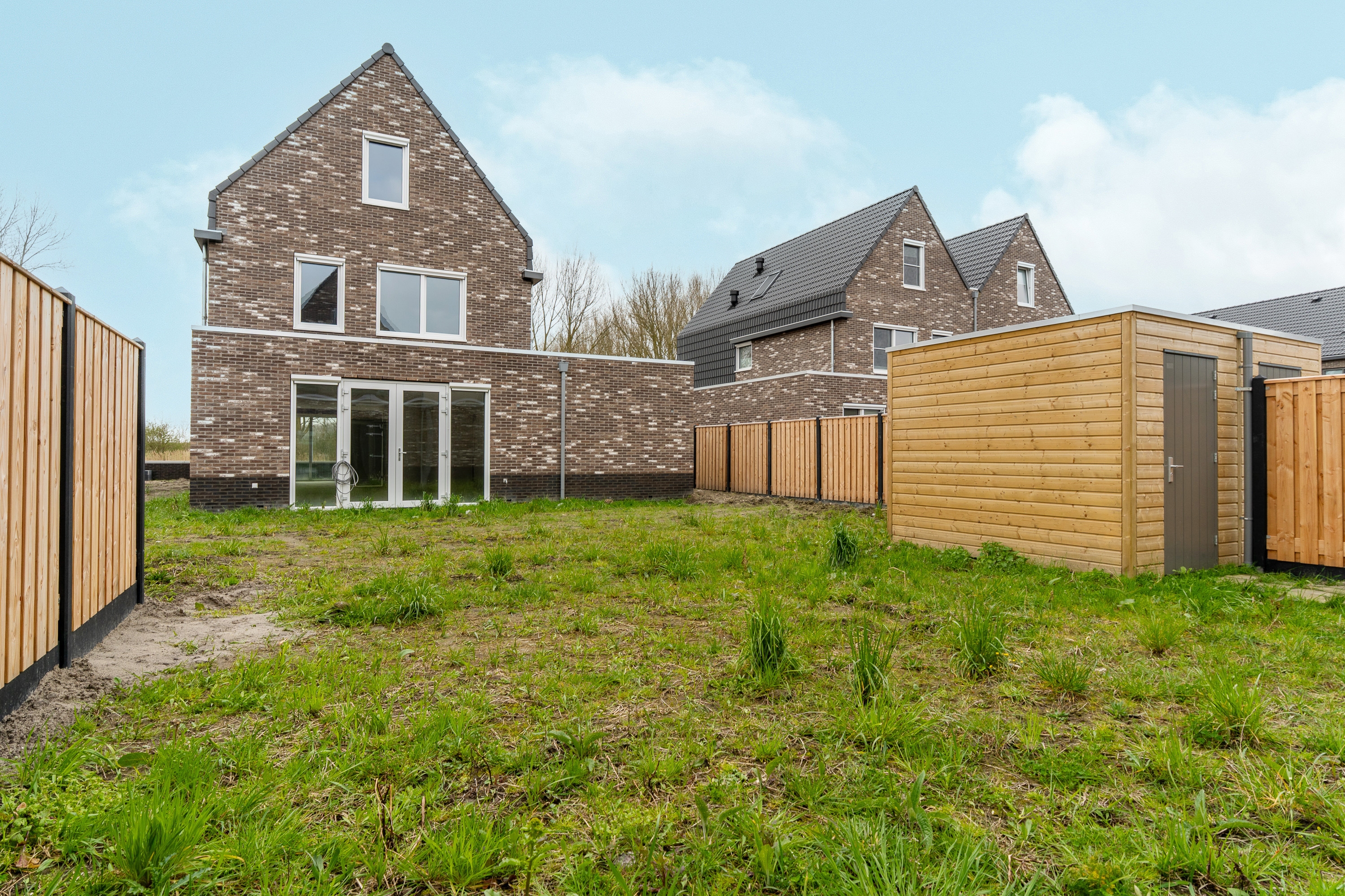De voortuin, gelegen op het noordwesten moet nog aangelegd worden. De oprit biedt ruimte voor het parkeren van 2 auto’s. De tuin loopt via de zijkant door naar achteren waar een houten berging aanwezig is. De achtertuin is gelegen op het zuidwesten. Alles kan nog naar wens van de koper worden aangelegd en ingericht. De schutting is al deels geplaatst en de tuin beschikt over 2 buitenkranen. Verder is een loze leiding aangelegd voor een elektrische laadpaal.