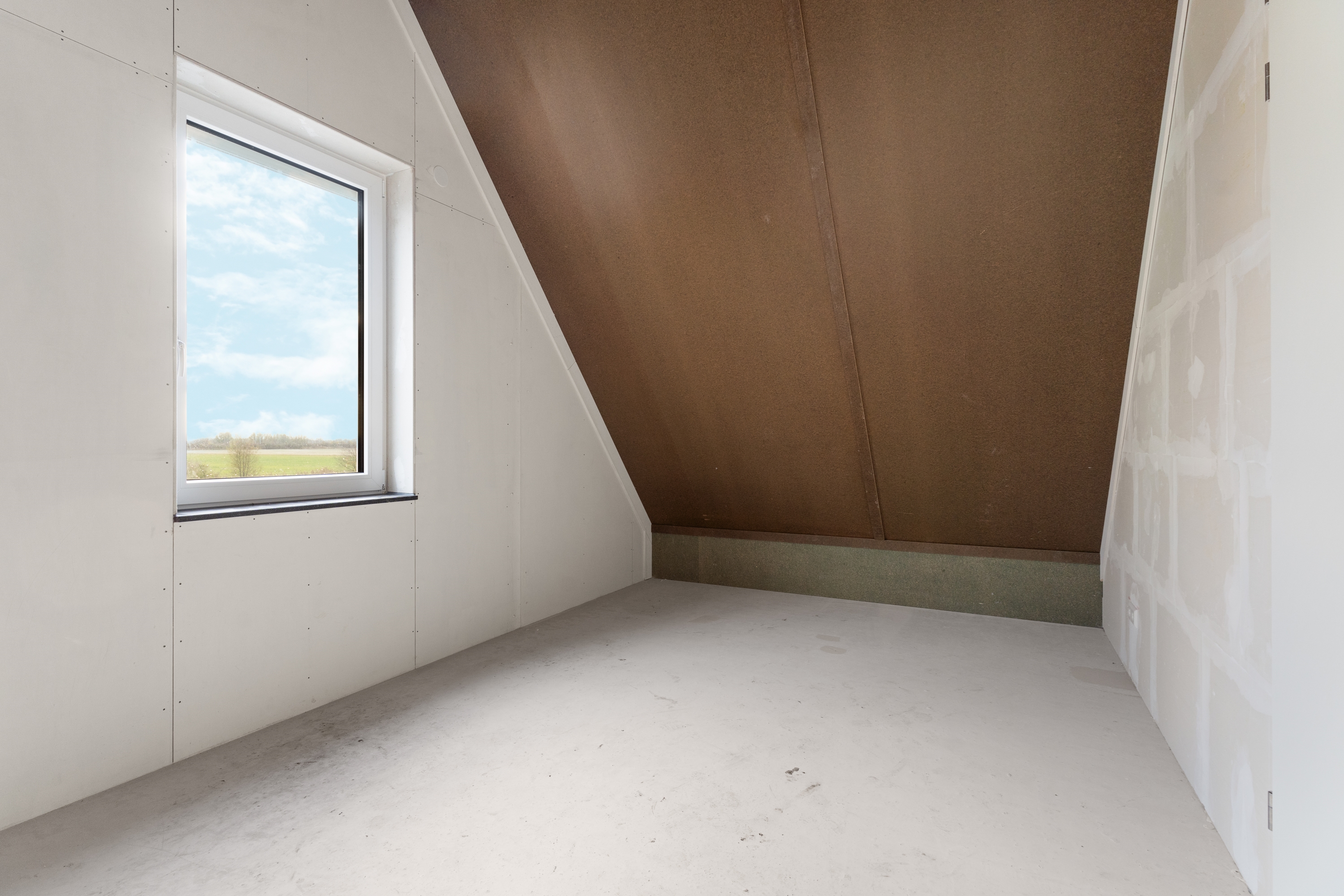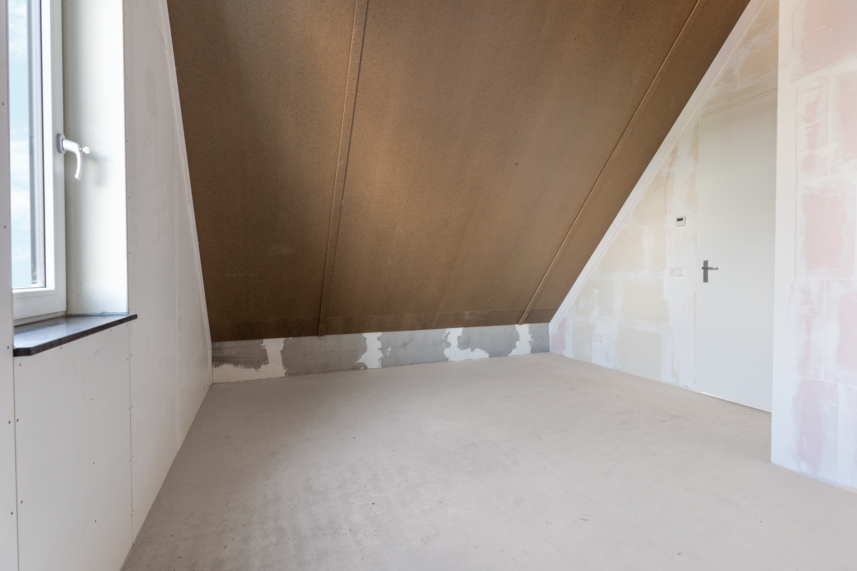 De vaste trap leidt naar de tweede verdieping. Op de overloop bevindt zich de opstelplaats voor de wasmachine. Via de overloop is toegang tot nog twee slaapkamers. De technische installaties zijn in een aparte ruimte opgesteld. De zolderverdieping oogt zeer licht en ruim door de vele raampartijen. Op de overloop zou ook nog eventueel een werkplek gerealiseerd kunnen worden. De gehele verdieping is voorzien van vloerverwarming.