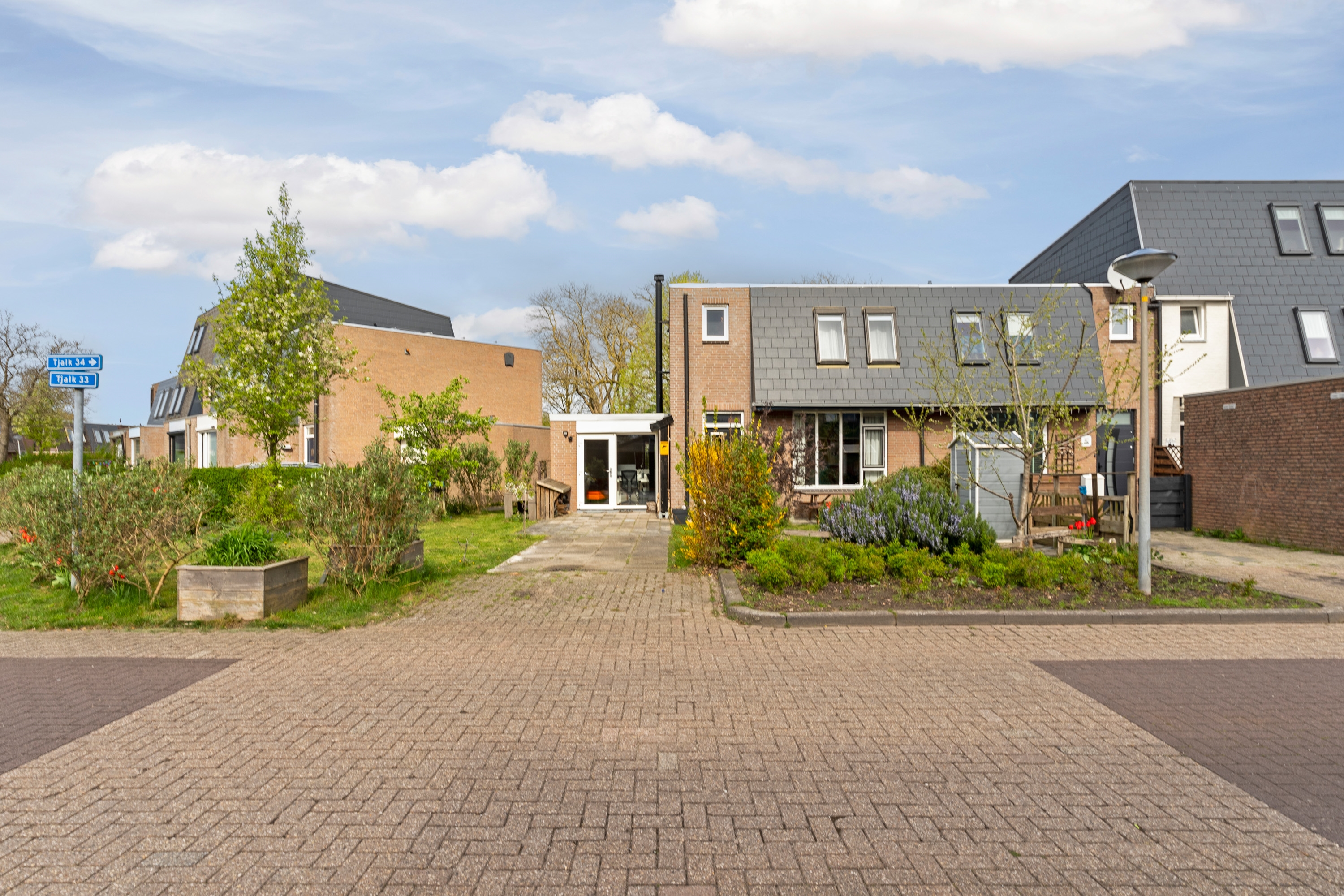 De voortuin is verzorgd aangelegd en ligt op het zuidoosten. Op de oprit is ruimte voor het parkeren van twee auto’s. Dankzij de hoekligging is de tuin breder dan gemiddeld. De achtertuin, gelegen op het noordwesten, is fraai aangelegd met een combinatie van bestrating, plantenborders en gras. Daarnaast beschikt de tuin over een berging en een achterom. Zowel in de voortuin als de achtertuin zijn buitenstopcontacten en wateraansluitingen aanwezig.