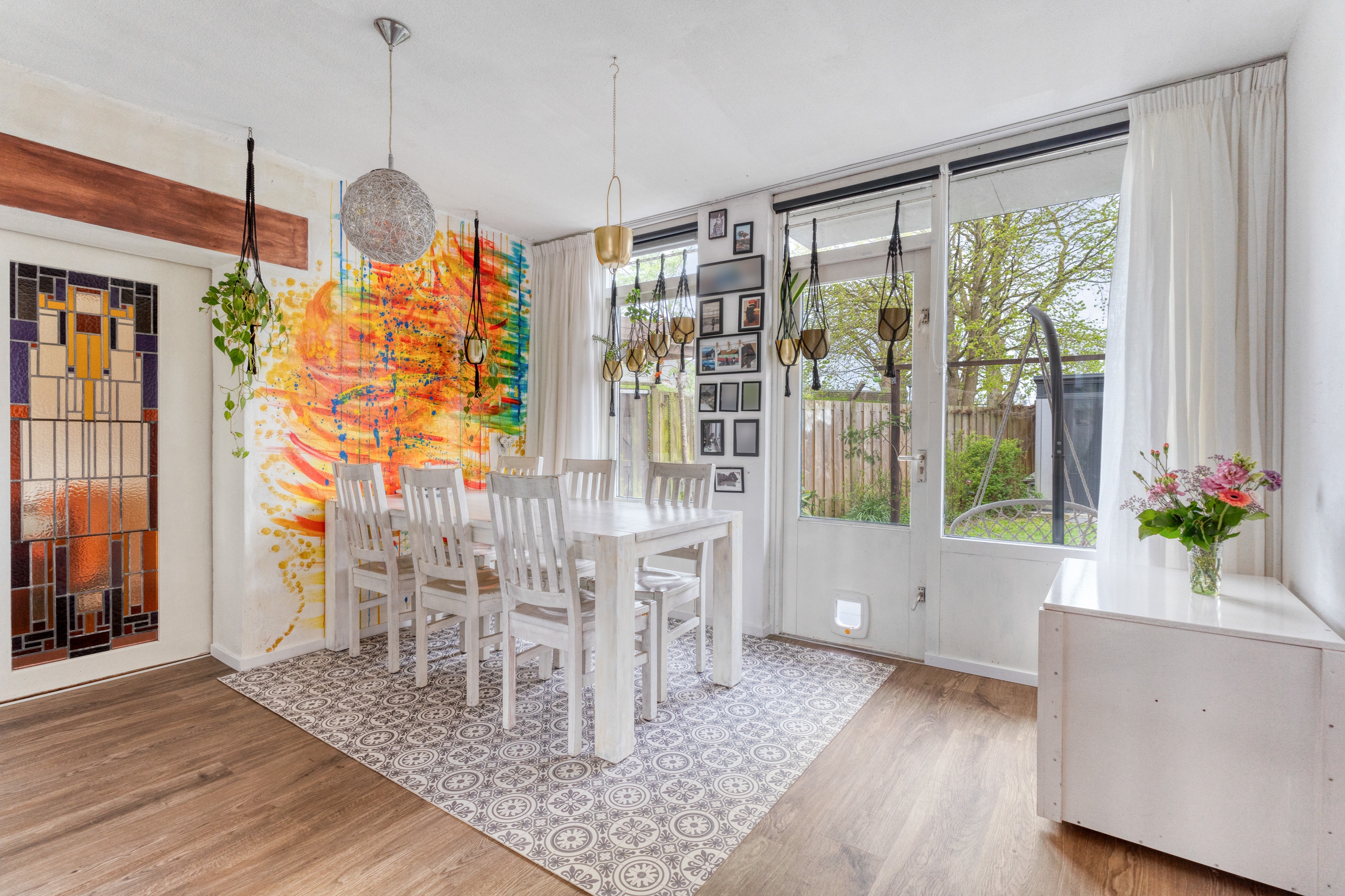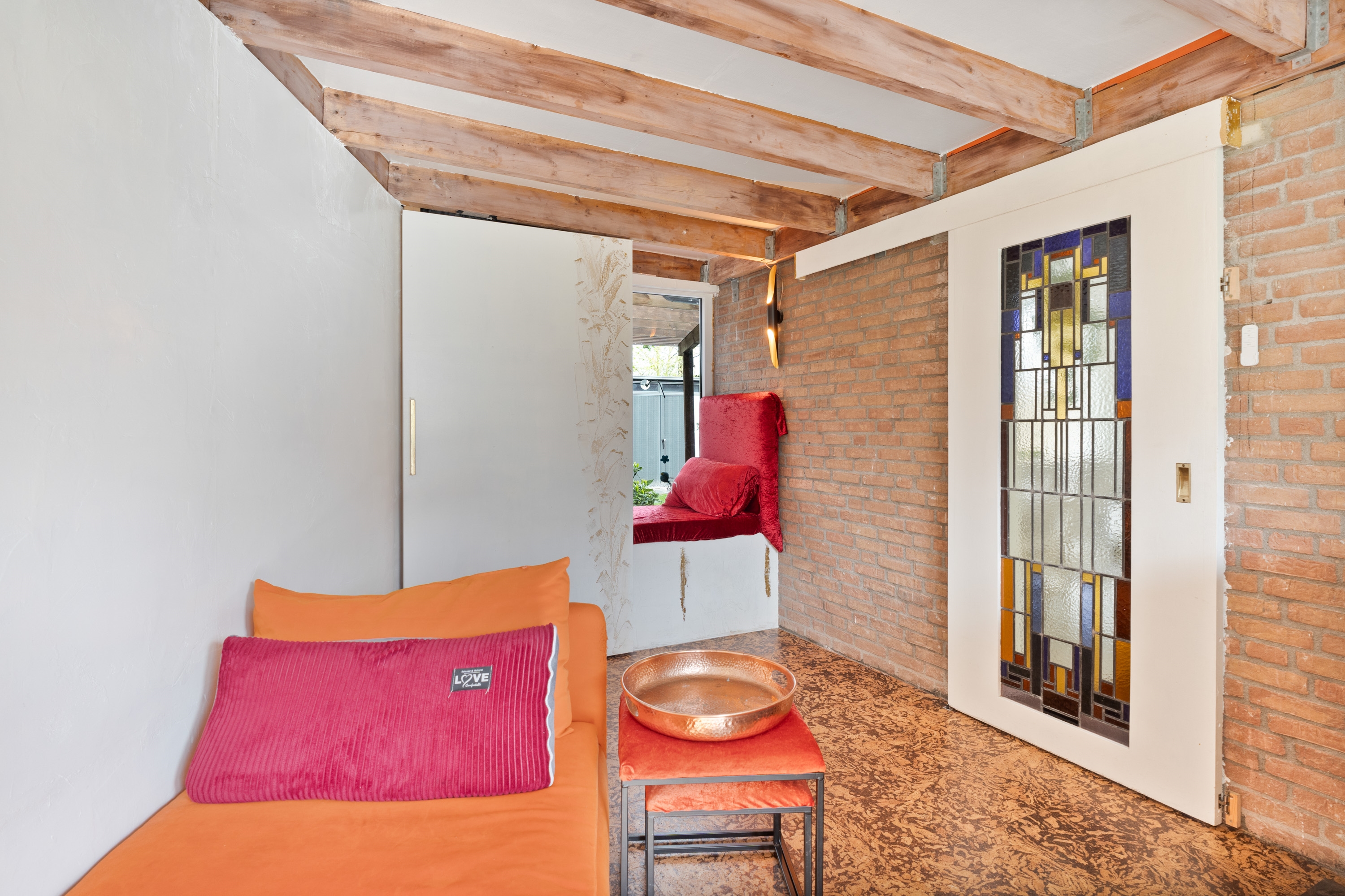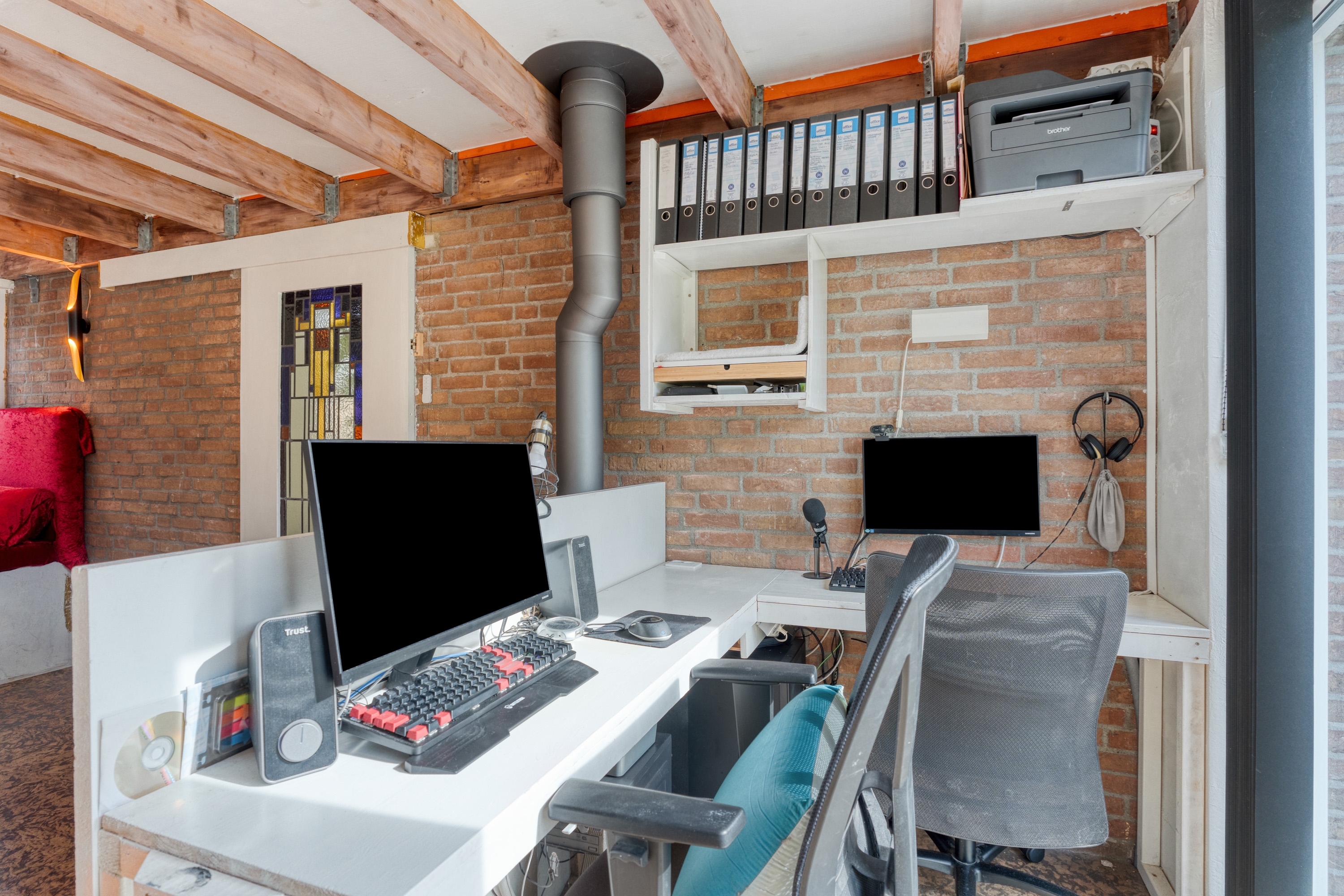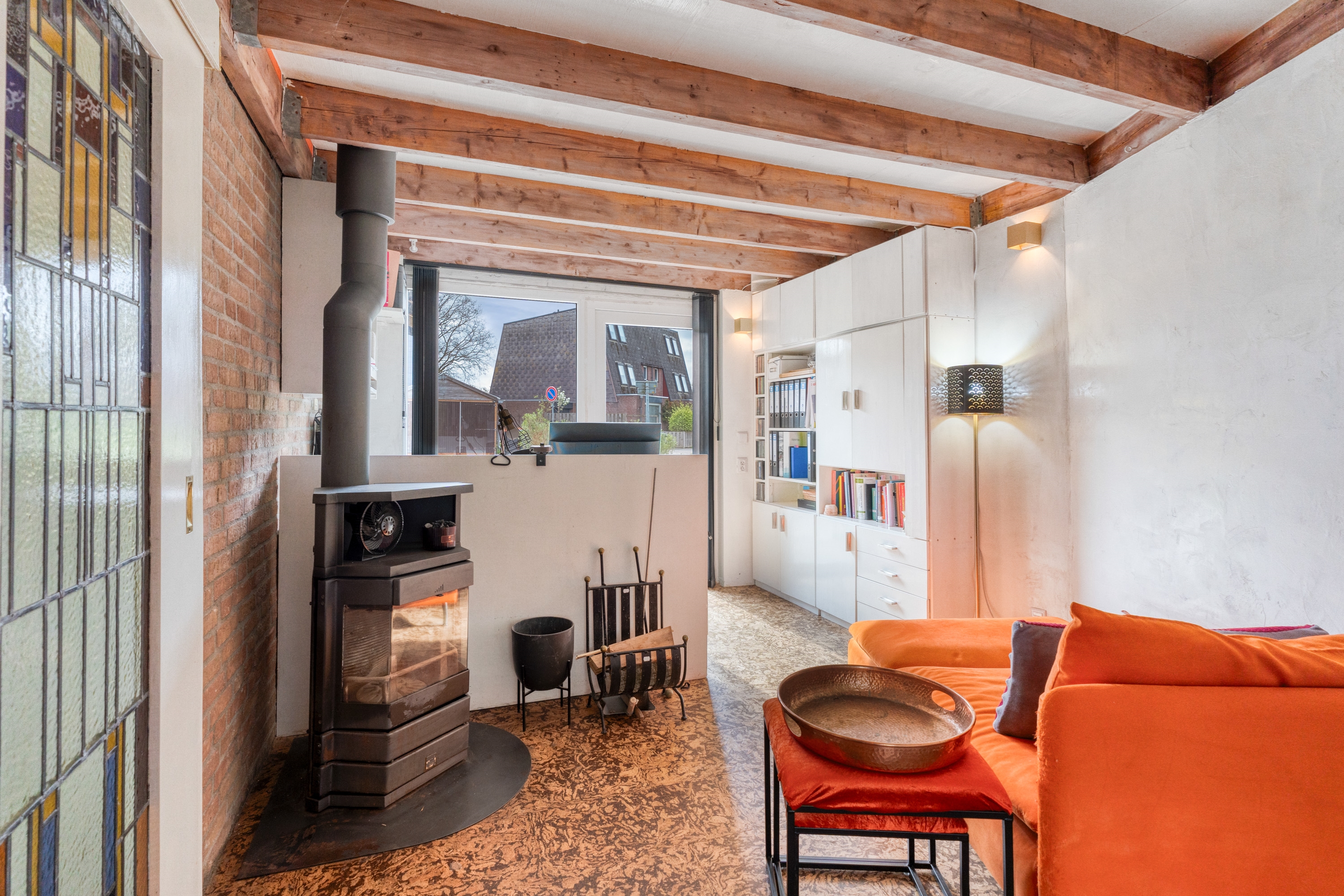 Wat deze woning extra bijzonder maakt, is de directe toegang vanuit de woonkamer tot de omgebouwde garage. Via een schuifdeur met glas-in-loodramen bereik je deze ruimte, die volledig is geïsoleerd en ingericht als werkkamer. Ideaal als kantoor aan huis, praktijkruimte of slaapkamer op de begane grond. Daarnaast zorgt een sfeervolle houtkachel voor extra warmte en gezelligheid.