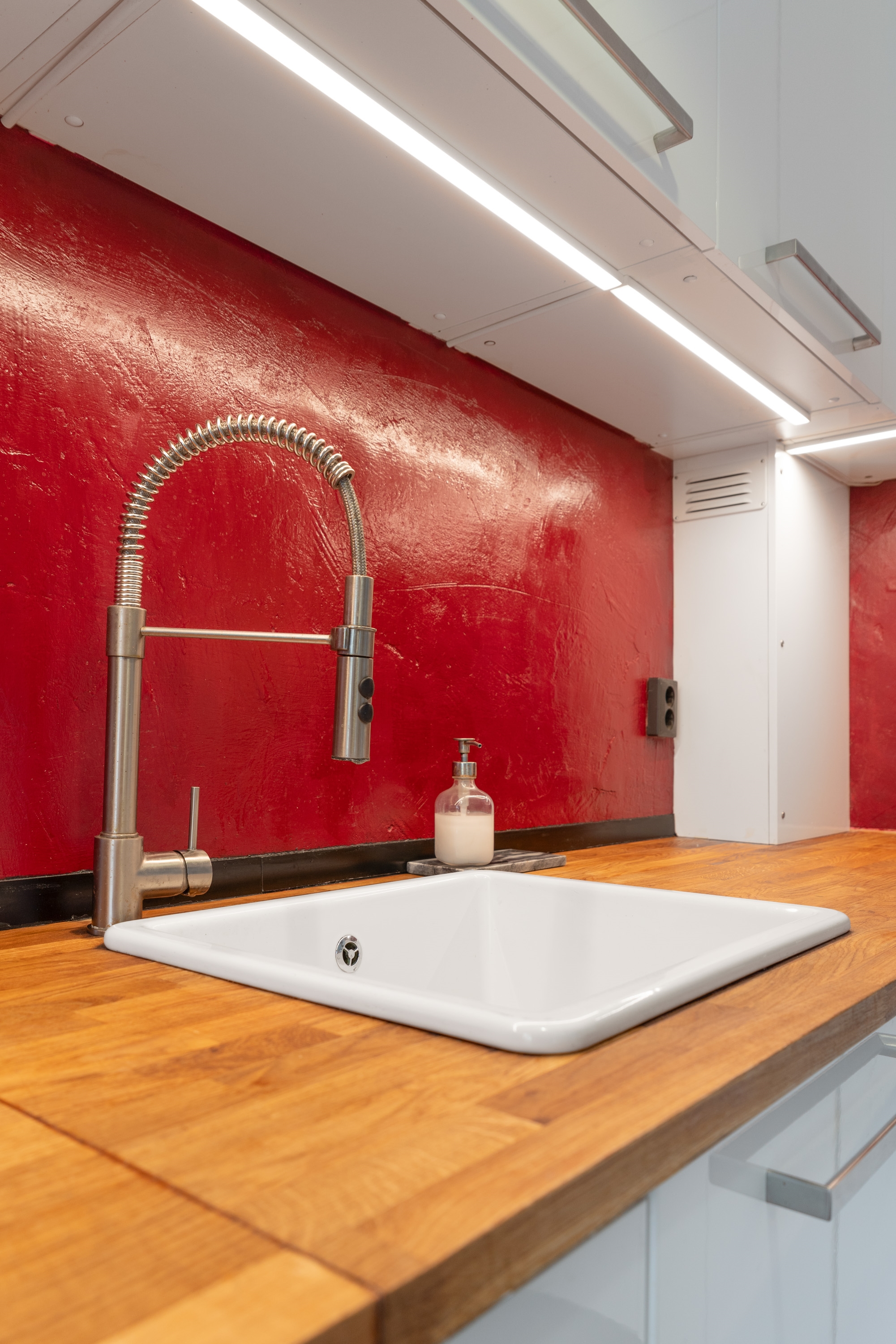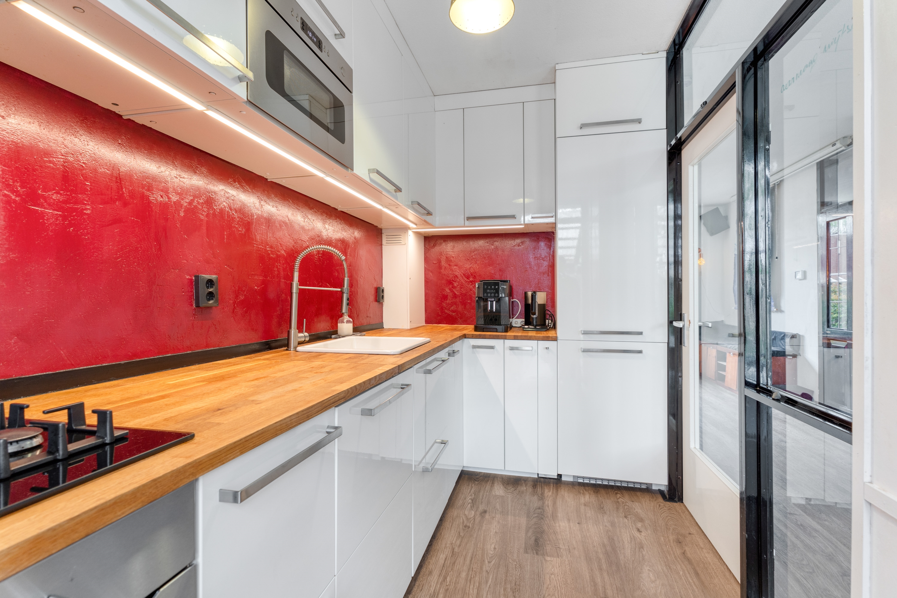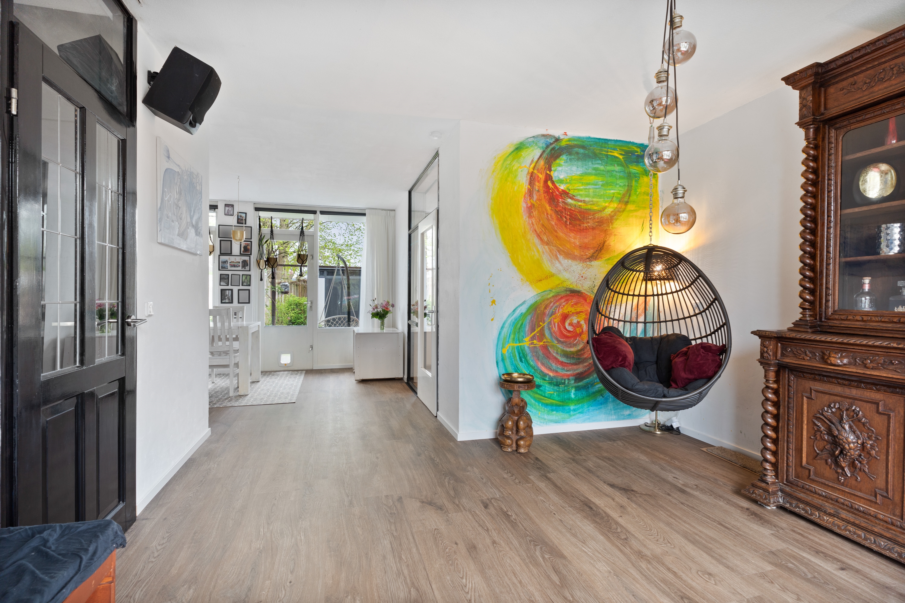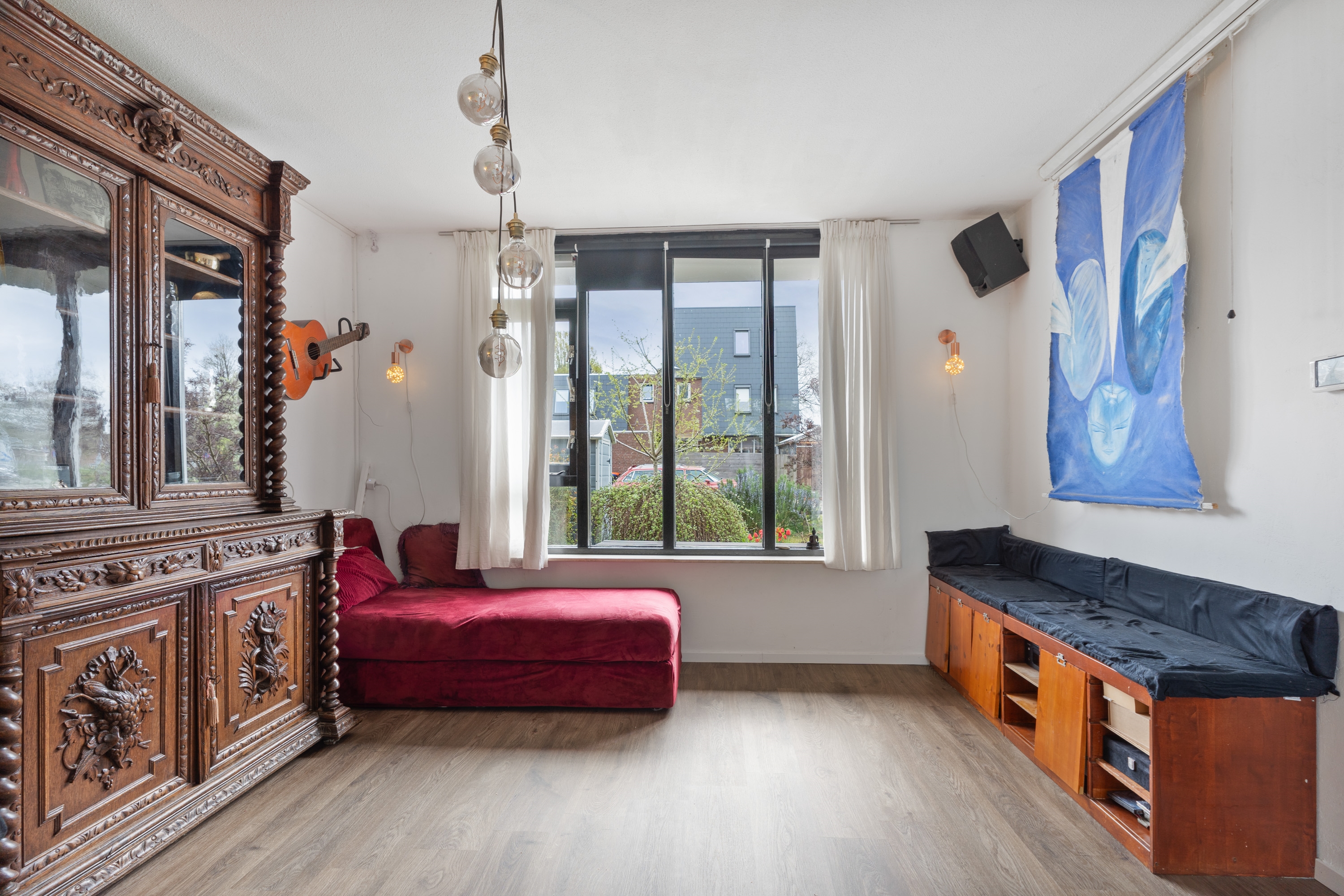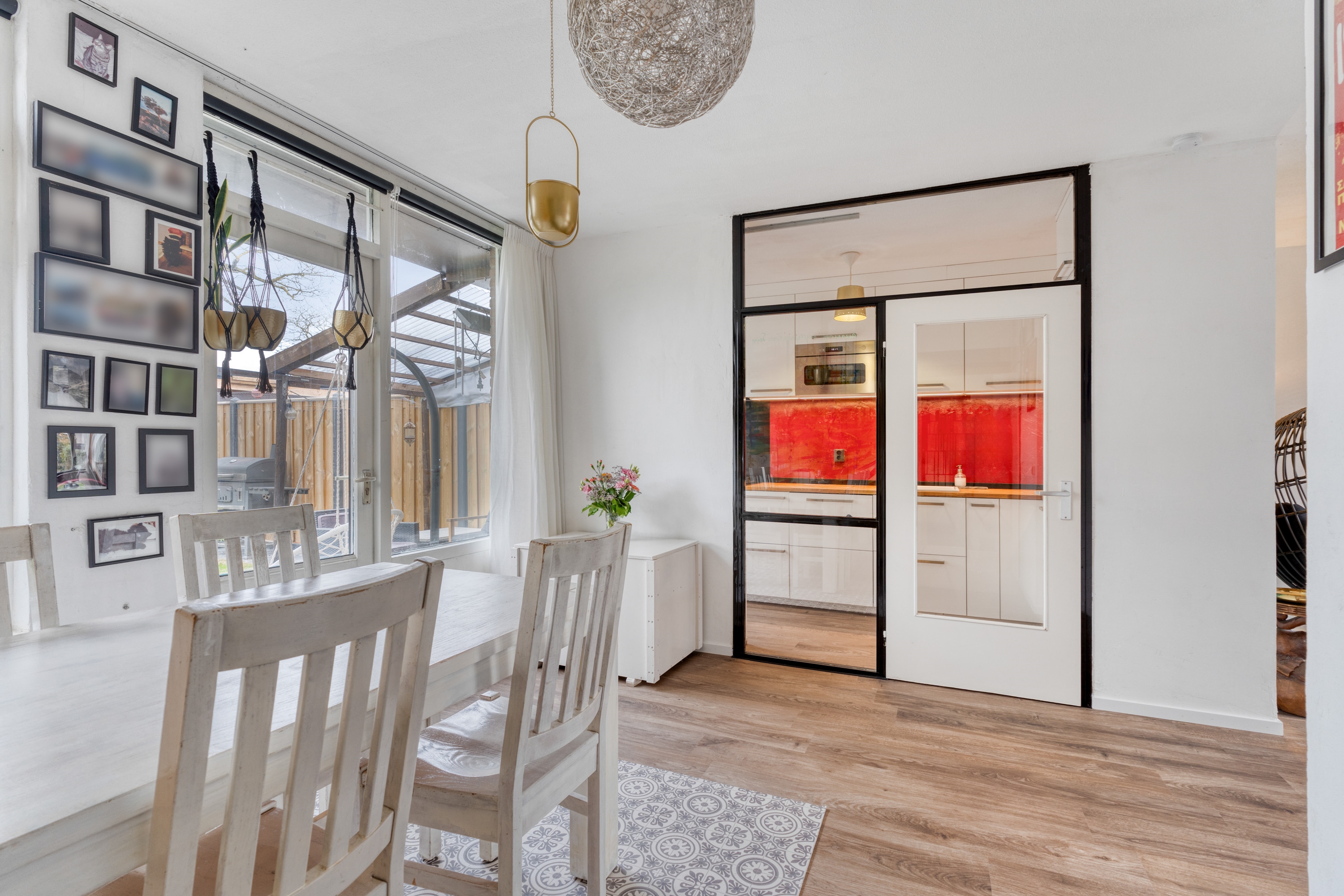 Wat deze woning extra bijzonder maakt, is de directe toegang vanuit de woonkamer tot de omgebouwde garage. Via een schuifdeur met glas-in-loodramen bereik je deze ruimte, die volledig is geïsoleerd en ingericht als werkkamer. Ideaal als kantoor aan huis, praktijkruimte of slaapkamer op de begane grond. Daarnaast zorgt een sfeervolle houtkachel voor extra warmte en gezelligheid.